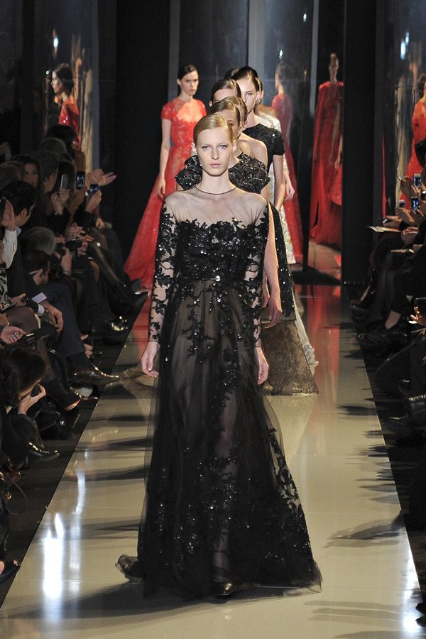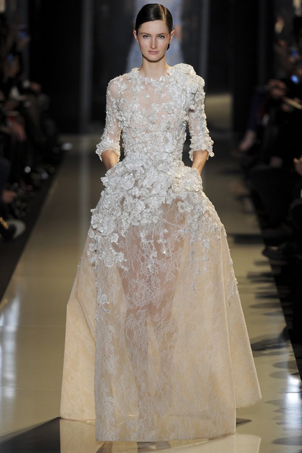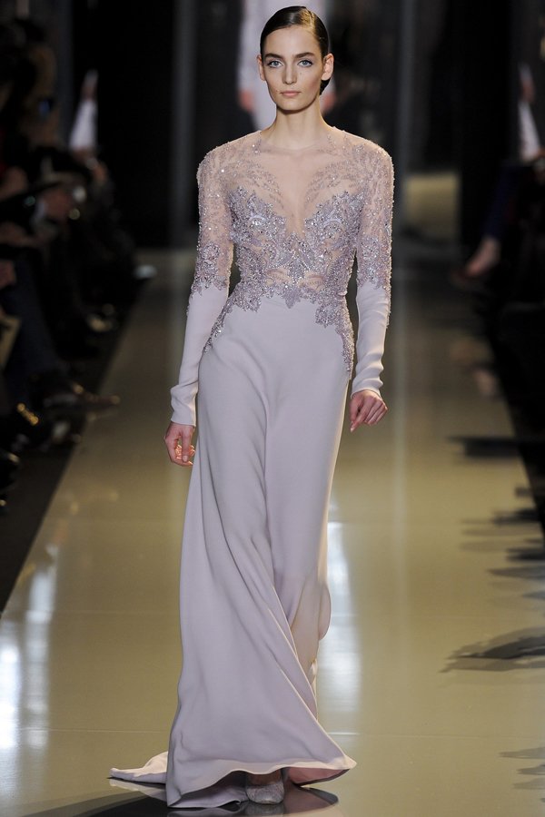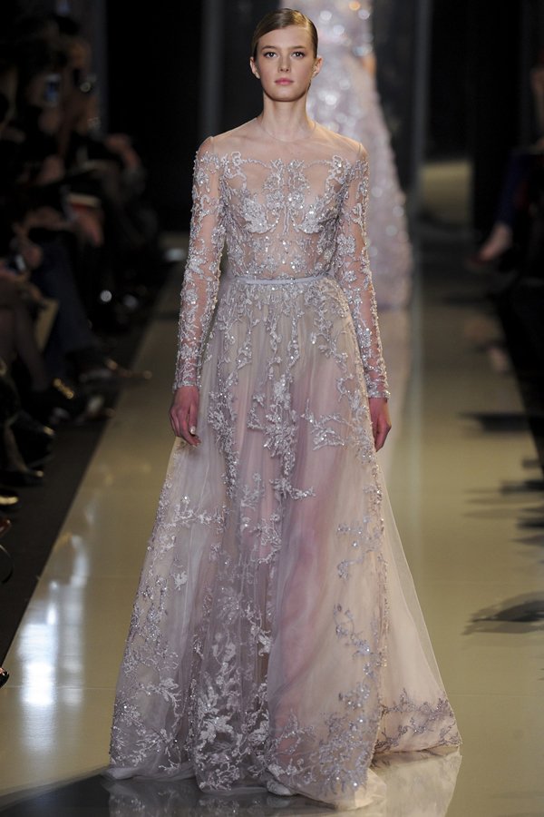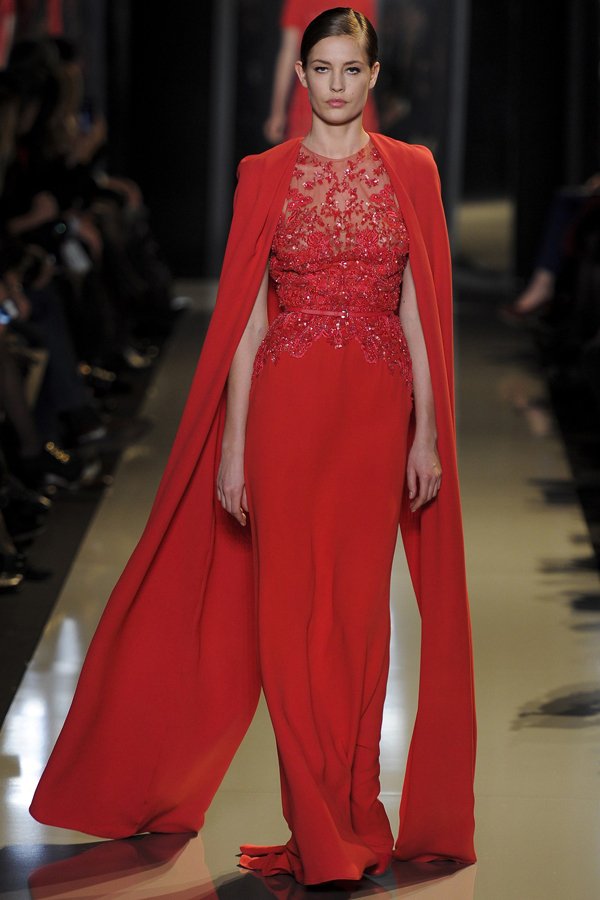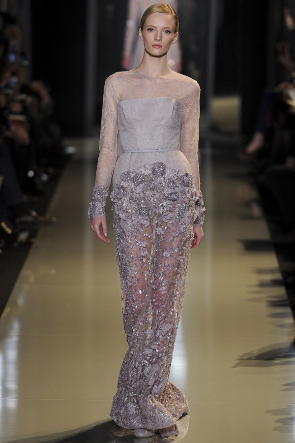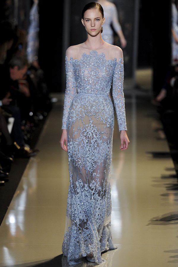 Elie Saab is a master of an evening dress. His Spring 2013 haute couture collection is all about femininity. The dreamy dresses and gowns feature elegant silhouettes and wispy fabrics as well as a signature sparkle. Color palette ranges from white to light blue, beige, lavender, gold, red and black.