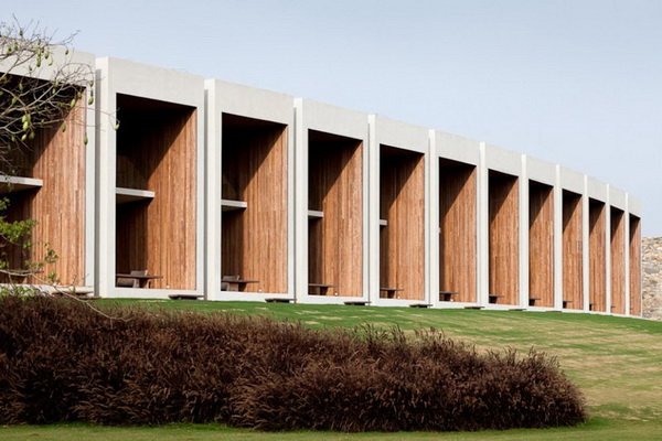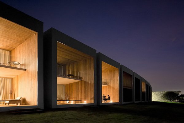 Wood panels, flooring and ceiling create a beautiful combination with the stonework, creating a sequence of volumes stretching across the land. In the lobby, drop down ceiling fire places encourage guests to relax and unwind, while the private quarters compose the perfect atmosphere for forgetting any stressful thoughts.