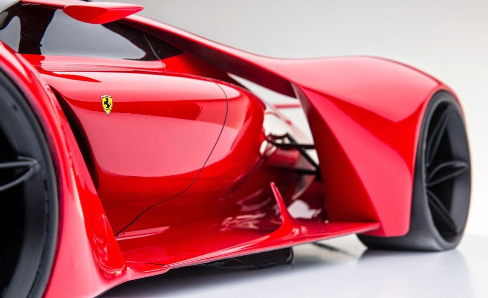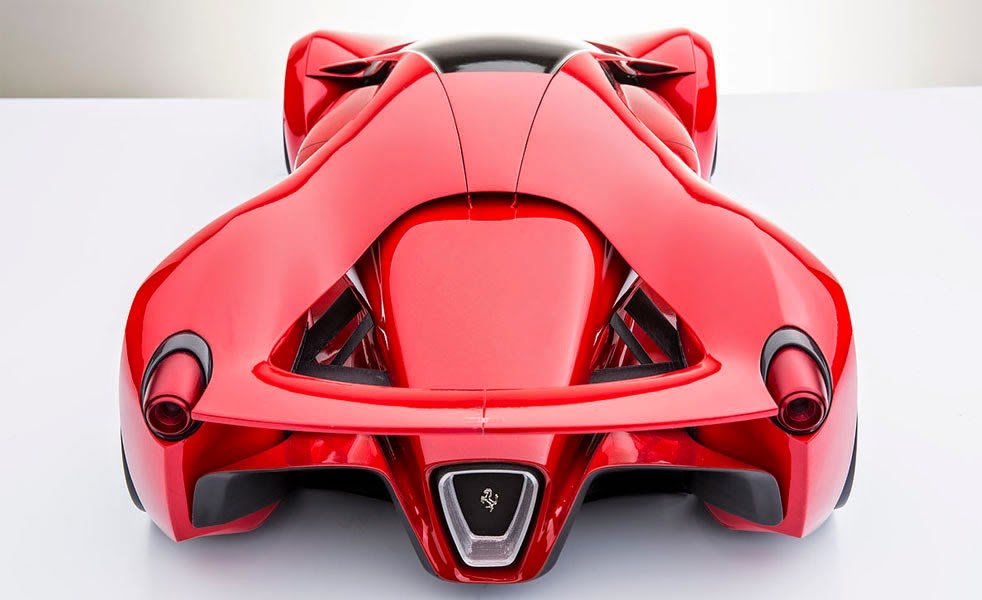 The vehicle is designed with Formula 1 architecture in mind with a blend of Ferrari’s LeMans heritage. Aerodynamics play an important role as the overall frontal area is decreased by the air channels that have been carved between the main body and the wheel arches. F1 A-arm suspension configuration is clearly visible through these openings. Other details such as the centralized exhaust are meant to decrease drag. The staggered seating positions of both driver and passenger are also closely related to that of F1 seating laying positions.