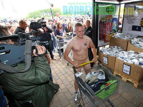 Mereka bebas berbelanja apapun yang mereka inginkan dan memasukkan sebanyak mungkin belanjaan ke dalam keranjang. Namun syaratnya, mereka harus berbelanja tanpa busana.