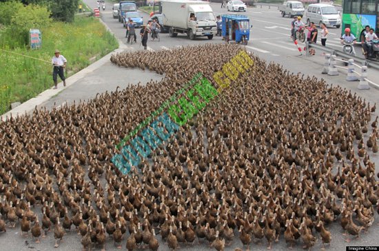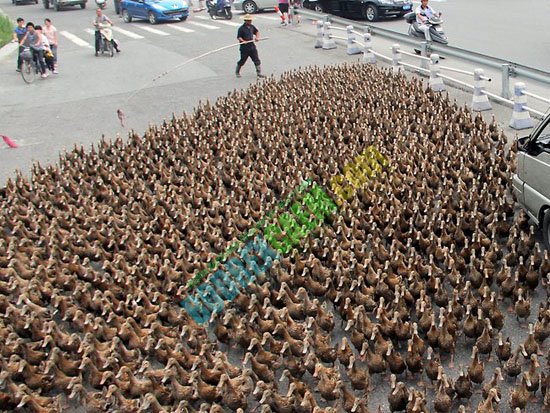 Ditemani seorang teman, peternak bernama Hong itu dengan santainya membawa ribuan bebek itu ke sebuah kolam untuk mencari makan an. Padahal, untuk mencapai kolam itu, rombongan itu harus melewati jalan raya.