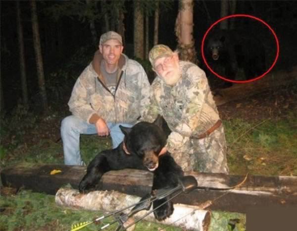 Namun, kamu tak akan pernah tahu jika ada seekor beruang lainnya yang siap menerkamu. Lihat saja di foto, dua pemburu ini seolah tak sadar jika ada seekor beruang hitam besar lainnya di belakang pohon yang seolah menatap mereka penuh benci karena melumpuhkan rekannya. Hmm, hati-hati lho, karma itu ada.