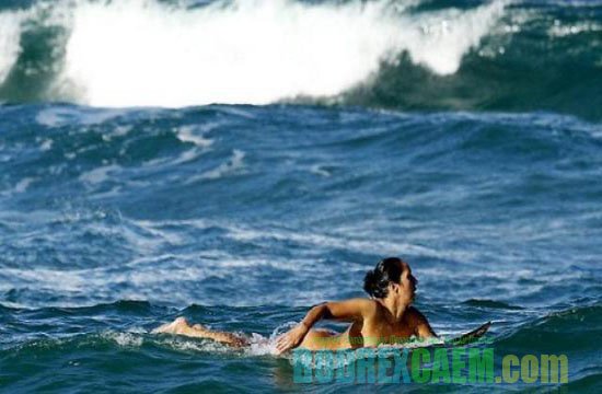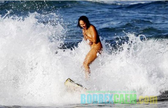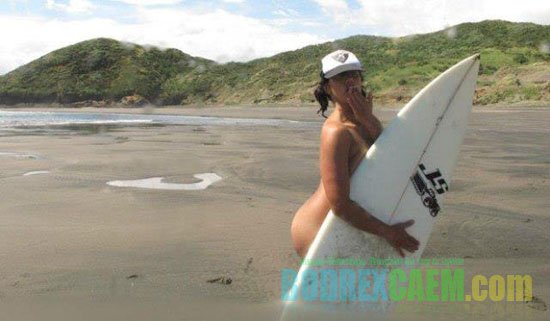 Para pengunjung pantai dibuat merah padam karena malu setelah seorang peselancar bertubuh bahenol dan berdada besar, Marama Kake, telanjang ketika berselancar di Noosa Beach, Queesland, Australia pada akhir Mei 2012.