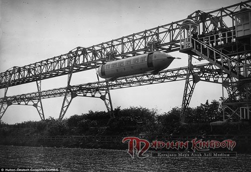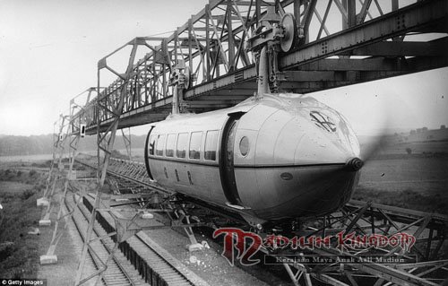 Foto-foto ini menunjukkan jalur uji dibangun di atas gelombang optimisme di Glasgow pada tahun 1930, ketika penemu George Bennie percaya Railplane yang terbaik digambarkan sebagai persilangan antara monorel dan pesawat akan memberikan gaya glamor, benjolan bebas, perjalanan tanpa asap di 120mph ke massa.