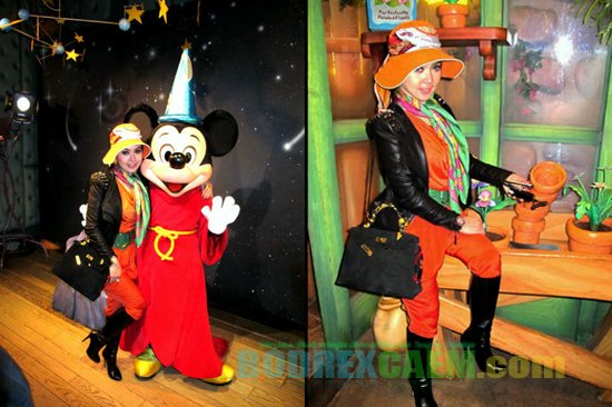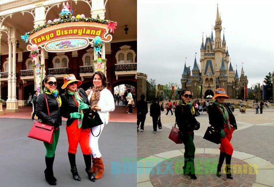 Syahrini mengenakan busana tabrak warna saat mengunjungi Disneyland Jepang. Ia tampil dengan pakaian berwarna terang yang dipadu dengan syal berwarna hijau. Ia juga melengkapi penampilannya dengan aksesori seperti sepatu boot dengan hak tinggi dan topi lebar berwarna oranye.