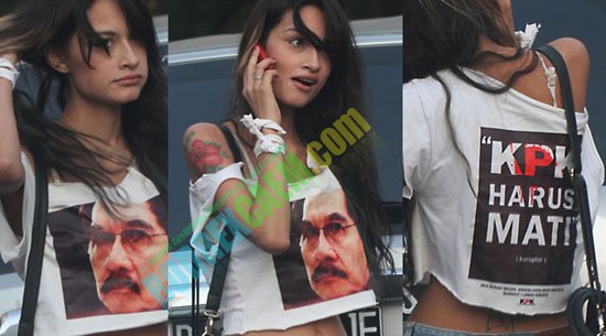 Bukan sesuatu yang berlebihan jika seloroh aduhai tercuat di ujung lidah. Rebecca memang seksi menawan. Meski hanya berbalut kaos buntung bertitel KPK HARUS MATI (koruptor) dan hot pants, dara kelahiran 21 Februari 1985 ini justru makin bikin gemas.