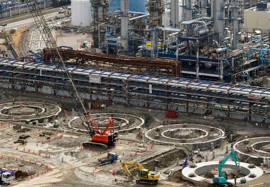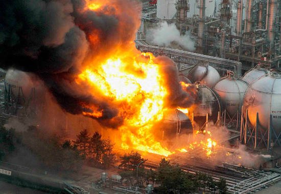 Fasilitas penyimpanan gas alam di Ichihara terbakar saat bencana datang. Pemulihan fasilitas tersebut diabadikan pada 7 Maret 2012. (Reuters/Kyodo).