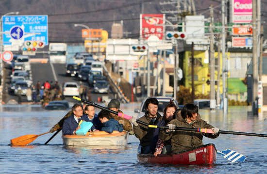 Orang-orang mengevakuasi dirinya dengan memakai perahu kecil di kota Ishinomaki di jalanan yang sama. (Jiji Press/AFP/Getty Images) dan (Toru Yamanaka/AFP/Getty Images).