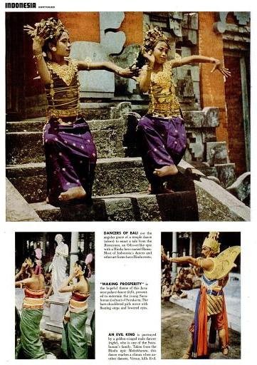 | Atas: penari Bali menarikan tarian yang diambil dari kisah Ramayana, banyak dari tarian Indonesia yang diambil dari kisah Hindu tersebut. Kiri bawah: Tarian istana untuk Sang Susuhunan Surakarta yang masih muda, tema tariannya “Menciptakan Kesejahteraan”. Kanan bawah: seorang kerabat Susuhunan Surakarta menarikan tarian dengan berperan sebagai raja jahat diambil dari kisah Mahabaratha. |