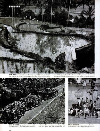 | Atas: Aktivitas persawahan di Pendang (Padang) Sumatra. Kiri bawah: para pekerja membawa bahan untuk membuat candi di Bali. Kanan bawah: wanita dan anak-anak mandi di sebuah kanal di samping jalanan padat. |