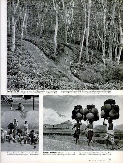 | Atas: Perkebunan teh dan kina di Bandung. Teh pertama kali diperkenalkan Belanda di Indonesia tahun 1832. Sebelum perang, Indonesia menghasilkan 18 % total teh dunia, karena perang menurun menjadi 4,5 %. Kiri bawah: wanita dan anak-anak mandi di sebuah kanal di samping jalanan padat, air yang dipakai bercampur dengan air bekas cucian, air minum diambil dari sumur. Kanan bawah: wanita Bali membawa pot tanah liat untuk dijual di Klungkung, ibukota tua Bali. |
