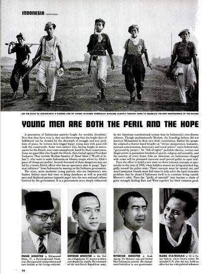 | Generasi muda harapan bangsa. Indonesia meraih kemerdekaannya setelah berjuang. Walaupun mayoritas Muslim, pendiri bangsa tidak mencantumkan nama “Muhammad” dalam konstitusinya. Tampak dari kiri: Muhammad Hatta: Perdana Menteri, negosiator kemerdekaan merrangkap Menteri Luar Negeri. Sultan Jogja: Menteri Pertahanan, umur 37 tahun, memimpin pasukan anti Belanda. Anak Agung: Menteri dalam Negeri, raja Bali berumur 30 tahun yang memperjuangkan federalisme dalam pemerintahan baru. Sutan Sjahrir: Negarawan berumur 40 tahun yang dibuang oleh Belanda, dia tidak memiliki kantor namun pengaruhnya sangat luas. |