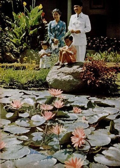 | Tampak Soekarno, Presiden Republik Indonesia dan sang istri Fatmawati, bersama dua anak mereka. |