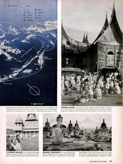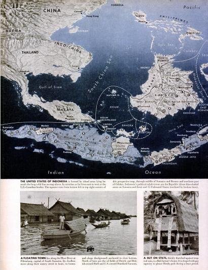 | Majalah LIFE menggunakan istilah “The United States of Indonesia” sebagai konsekuensi perjanjian KMB dimana Indonesia berbentuk federasi. Foto memperlihatkan kampung air di Sungai Musi dan rumah tradisional dari Bali. |