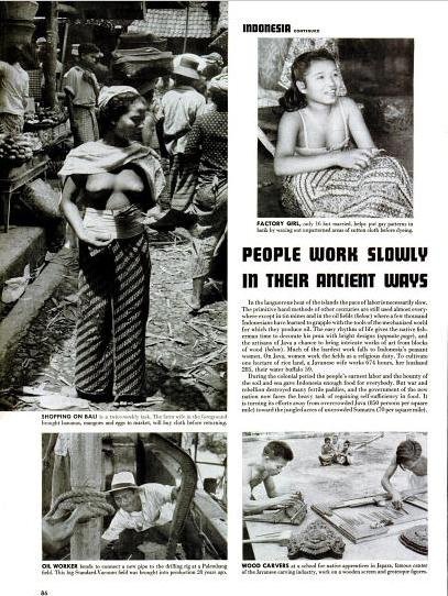 | Keunikan kehidupan di Indonesia, disebutkan bahwa kehidupan di Indonesia berjalan lambat, namun justru karena itu tercipta maha karya seni. Saat zaman kolonial, air dan tanah cukup untuk menghidupi semua, namun perang banyak menghancurkan area persawahan. Kiri atas menunjukkan wanita Bali berbelanja. Kanan atas memperlihatkan perempuan 16 tahun sedang membatik, kiri bawah tentang seorang pria yang bekerja di tambang minyak, kanan bawah menunjukkan pengrajin kayu dari Jepara yang terkenal dengan ukirannya. |