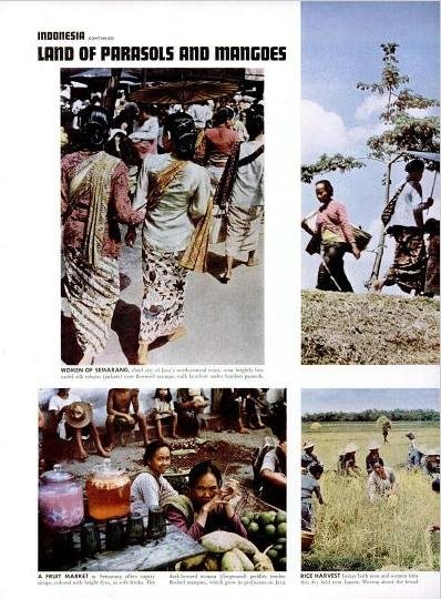 | Indonesia: Tanah kaya payung dan mangga. Foto atas: wanita Semarang dengan kebaya dan sarung batik yang indah berjalan di bawah payung bambu bertelanjang kaki. Foto kiri bawah: penjual minuman sirup buah di Semarang. Kanan bawah: panen padi di Jepara. |