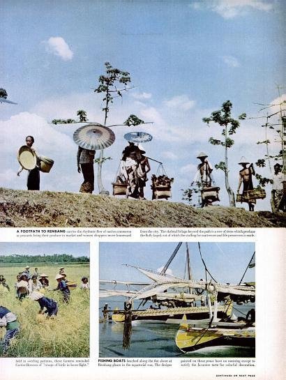 | Atas: Jalan setapak menuju Rembang, nampak para petani membawa hasil pertanian dan terlihat pula pohon kapuk. Kanan bawah: perahu nelayan di Rembang yang diberi warna-warna yang tak lain hanya untuk memenuhi hasrat seni masyarakat Jawa. |
