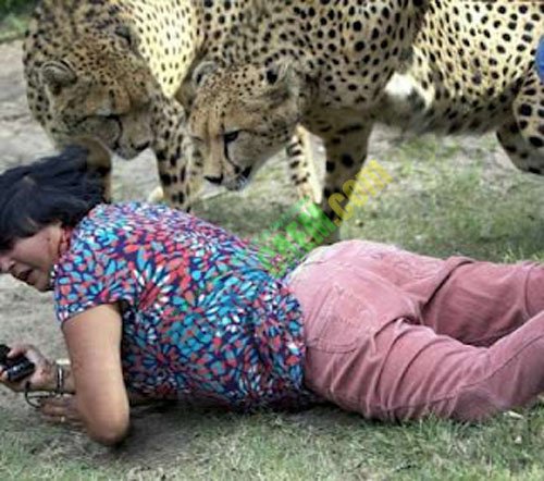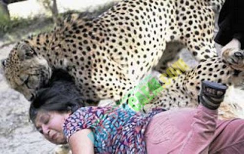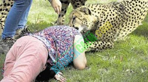 Seorang wanita Inggris diterkam oleh seekor cheetah di sebuah taman safari di Afrika Selatan dan gambanya diabadikan secara tidak sengaja oleh suami yang memotretnya. Sontak saja liburan yang tadinya diharapkan akan menyenangkan berubah menjadi horor yang mengerikan.
