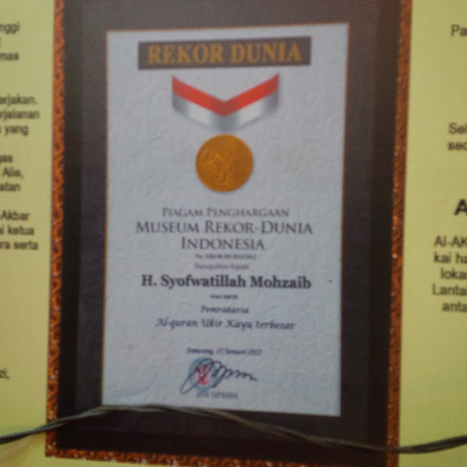 Al-Quran yang dinamai Al-Akbar ini disebut-sebut sebagai ukiran kayu terbesar dan pertama di dunia dalam bentuk Al-Quran lengkap 30 juz. Al-Quran raksasa ini dibuat dari kayu jenis tembesu dan diukir ala seni ukiran kayu tradisi Palembang. Ianya dipamerkan di ruangan khas yang dibina 3 tingkat di sebelah rumah kediaman Bapak Haji Sofwatillah ini.
