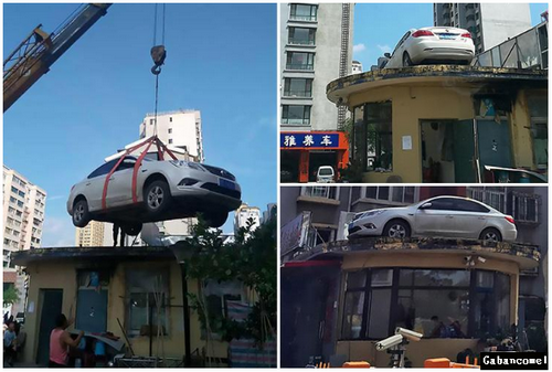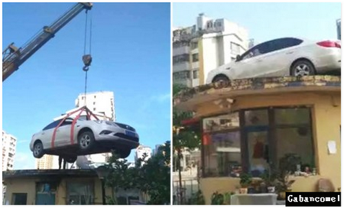 Bukan sahaja berpindah tempat, tetapi kereta itu juga diangkat dan diletakkan di atas bumbung rumah pengawal keselamatan kawasan perumahan itu.