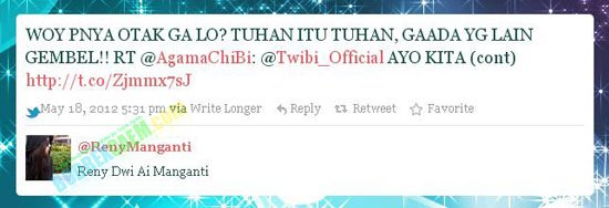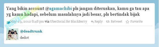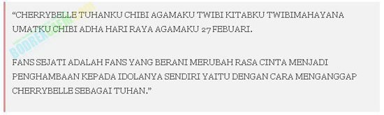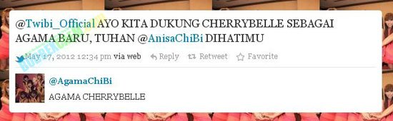 Hal ini dibeberkan oleh sebuah akun Twitter @AgamaChibi yang menganggap bahwa Cherry Belle adalah Tuhan. Akun twitter yang hingga hari kini memiliki 593 followers itu terus men-twit kata-kata yang tidak rasional dan hiperbolis. Akun tersebut mengajak para pengguna twitter untuk mengikuti agama baru.