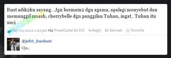 Tidak hanya melalui akun Twitter, bahkan pengungkapan itu juga ada disebuah Fan Page Facebook bernama �Cherrybelle Tuhan Semesta Alam� dan sebuah situs blog bernama tuhancherrybelle.blogspot.com. Hujatan pun juga datang dari para facebookers dimana mereka memposting makian di wall tersebut. Dalam Fan Page Facebook tersebut, pemilik akun jelas menuliskan bahwa :
