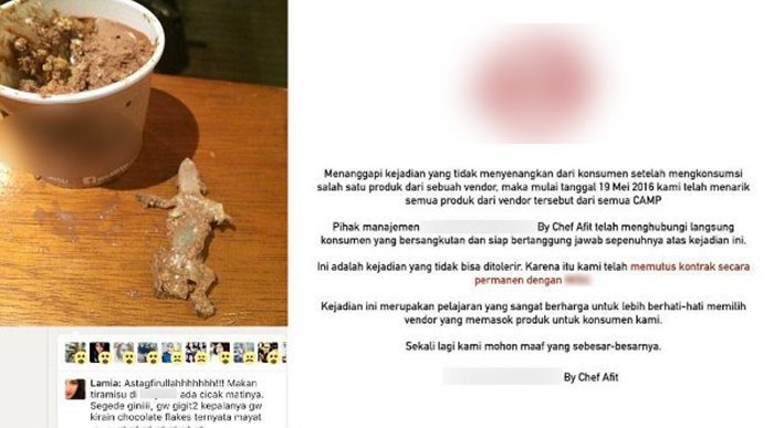 Mendengar adanya kabar Bangkai Cicak di Tiramisu tak mau perusahaanya tercoreng, pada akhirnya pihak perusahaan mengklaim dengan pengumuman apabila perusahaan sudah menarik semua jenis Tiramisu yang dimakan oleh Lamia dan ini adalah pernyataan resmi. Kabar terbarunya, Lamia dan perusahaan restoran tersebut telah berhubungan dan pihak resto memberikan apresiasi atas info yang diungkap oleh Lamia.