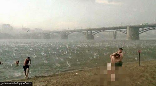 Tiba-tiba angin kencang menghentam pantai berpasir di Novosibirsk pada Sabtu petang ketika beratus-ratus orang sedang menyejukkan diri di musim panas dengan berenang di pantai. Dalam video kelihatan bagaimana orang-orang berlarian mencari tempat perlindungan dari hujan ais yang menyakitkan itu.
