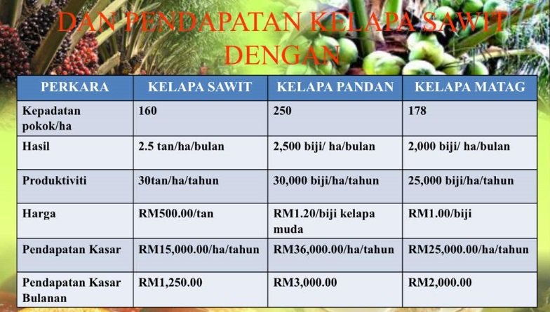Berapakah pulangan penanaman kelapa berbanding dengan tanaman lain masa kini?. Itu merupakan satu persoalan penting yang ingin dibincangkan untuk mempastikan aktiviti menanam kelapa ini diterima petani sebagai satu pilihan bidangusaha yang memberikan pulangan terbaik. Jadual diatas menunjukkan bagi tanaman KELAPA SAWIT yang kepadatannya adalah 160 pokok sehektar yang akan memberikan hasil sebanyak purata 2.5 tan/ ha/ sebulan atau pun produktiviti sebanyak 30 mt /ha/ tahun. Jika harga buah kelapa sawit dikira sekitar RM500 satu metrik tan maka jumlah pendapatan kasar adalah sebanyak RM1,250.00 sebulan. Bagaimana pun harga buah kelapa sawit turun sehingga RM350 satu metrik tan dan pernah mencecah sehingga RM700 satu metrik tan dahulu. Bagaimana pun lazimnya penanaman kelapa sawit oleh pihak estet adalah dalam jumlah keluasan yang besar. Jika penulis blog hendak dibandingkan dengan tanaman KELAPA PANDAN (Aromatic coconut), jumlah kepadatan tanaman adalah sebanyak 250 pokok sehektar dan memberikan hasil sekitar 2,500 biji sehektar sebutlan atau lingkungan 30,000 biji sehektar setahun. Tinjauan menunjukkan purata harga ladang biji kelapa pandan muda adalah RM1.20 sebiji. Ini memberikan pendapatan dari penanaman kelapa pandan sebanyak RM36,000 sehektar setahun atau purata sekitar RM3,000 seebulan iaitu lebih tinggi daripada pendapatan kasar bulanan kelapa sawit (perbezaan lebihan sebanyak RM1,270 sehektar sebulan). Seterusnya bagi penanaman KELAPA HIBRID MATAG yang menjadi sasaran penanam kelapa masa kini, kepadatan tanaman kelapa MATAG adalah sebanyak 178 pokok sehektar. Pokok kelapa ini yang dijaga dengan baik menghasilkan sebanyak 2,000 biji/hektar sebulan atau sekitar 25,000 biji/ hektar/ setahun. Jika harga kelapa tua matag ini diladang RM1.00 sebiji maka purata pendapatan kasar dari kelapa Matag ini sekitar RM25,000 sehektar setahun atau sekitar RM2,000 sehektar sebulan. Pendapatan ini didapati lebih tinggi dengan penanaman kelapa sawit (Lebihan sebanyak RM750 sehektar sebulan). Berdasarkan kepada fakta diatas penanaman kelapa pandan memberikan didapati pulangan paling tinggi diikuti dengan penanaman kelapa matag dan terakhir adalah penanaman kelapa sawit. Bagaimana pun tinjauan penulis diladang kelapa matag di Pontian dan Batu Pahat yang menjual Buah Kelapa Matag Muda untuk diambila air kelapa didapati jauh lebih menguntungkan penanam kelapa matag. Ini kerana buah kelapa matag muda dijual dengan harga sehingaa RM1.50 – RM1.70 sebiji kerana saiznya yang lebih besar dan kandungan airnya lebih banyak selain keenakan airnya yang tidak kurang hebatnya. Tinjauan penulis dibanyak tempat yang menjual produk Coconut Shake dan Air Kelapa dimana penjual lebih sukakan kelapa matag muda.