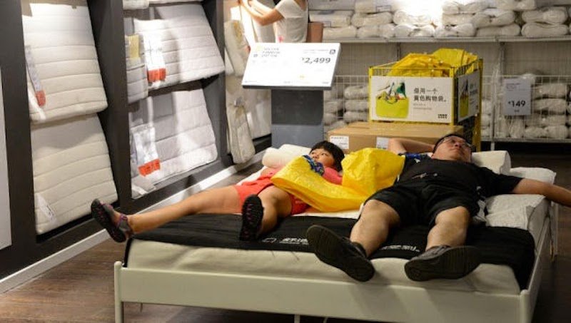 Pekerja-pekerja IKEA di China terpaksa melakukan tugasan tambahan iaitu memantau dan mengejutkan pelanggan yang tidur di perabot mereka. Mereka juga mendakwa selepas seorang pelanggan dihalau, akan ada orang lain yang datang dan tidur di tempat yang sama dan ianya berulang beberapa kali setiap hari. Anda boleh lihat betapa seriusnya masalah ini melalui foto-foto dibawah: