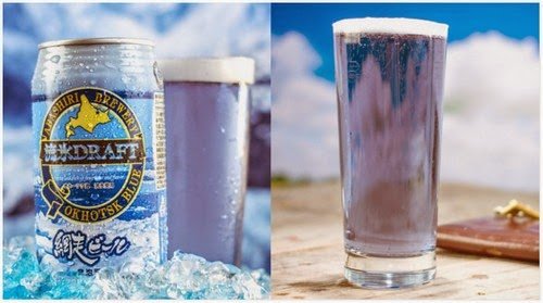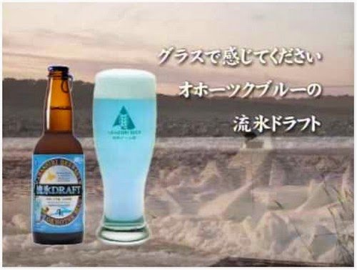 Bir unik berwarna biru ini katakan dibuat dari lelehan gunung ais yang dikumpulkan dari laut Okhotsk di pantai Jepun. Sedangkan warna birunya ternyata terbuat dari campuran rumput laut biru dan bunga tempatan.