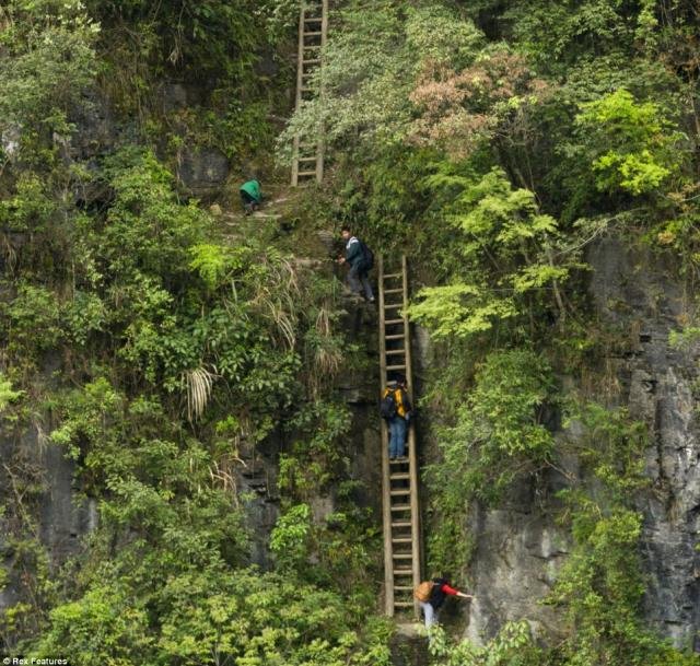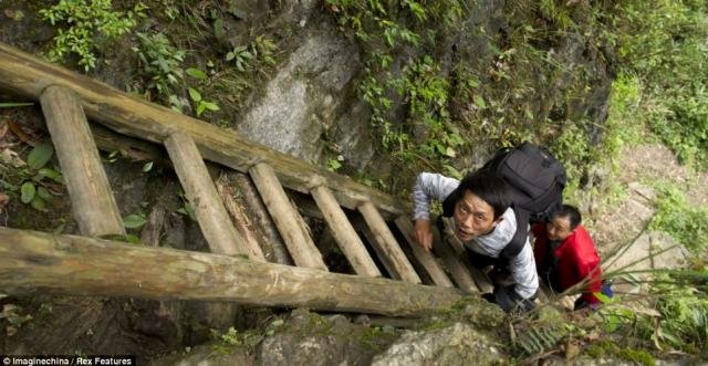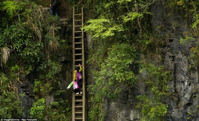 On the plains of South China, in a village located on a hilltop and is inhabited only 100 people, the children have struggled down the stairs on the left wall of the cliff every school.
