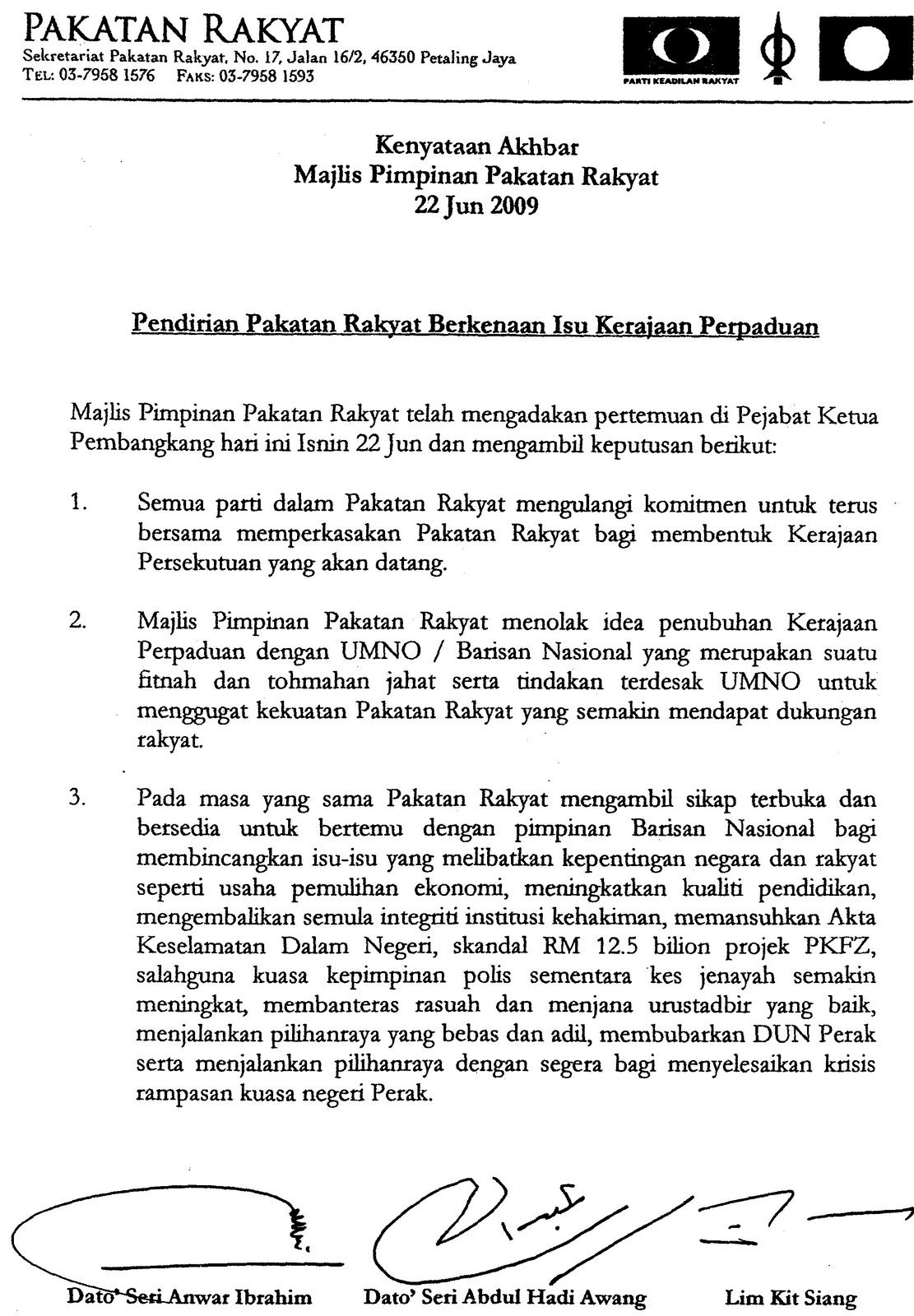 “Apa yang saya faham sebagai maksud DS Presiden ialah kerajaan gabungan di antara BN dan PR. Gabungan ini akan menjadikan semua pihak sebahagian dari kerajaan yang memerintah dan tiada pembangkang buat seketika. Dengan itu persengketaan dapat dielak dan semua boleh tumpu kepada persoalan menghadapi dan mengatasi kegawatan ekonomi yang sedang menimpa.”
