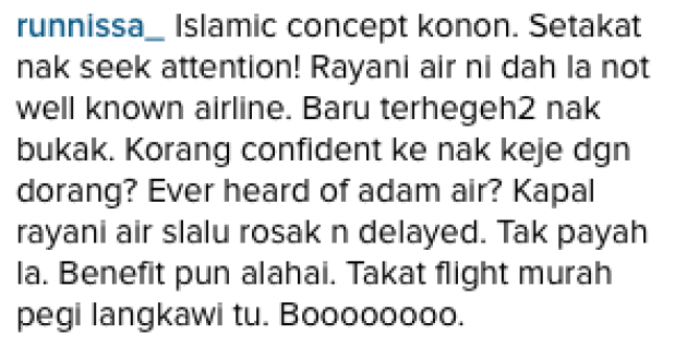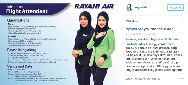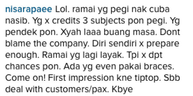 Ada juga yang mengamuk kerana mereka tak layak kerana pakai braces. Err.. rasanya kalau nak jadi pramugari/pramugara memang tak boleh pakai braces kan? Eh tak tahu la. Tapi dalam banyak-banyak komen negatif yang diterima Rayani Air, ada juga yang back up.