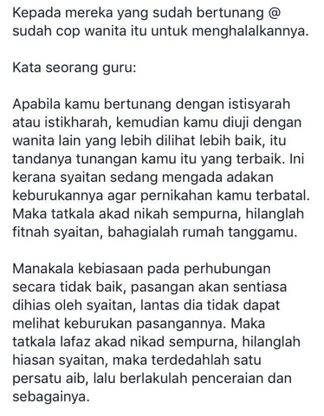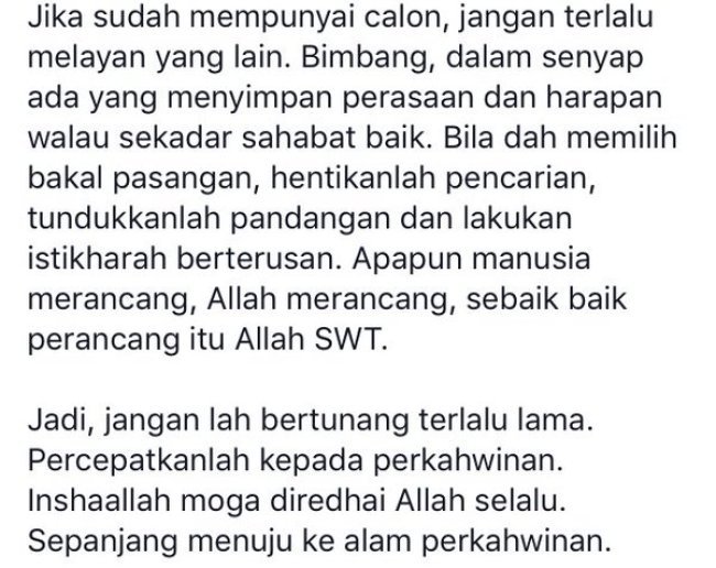 Buat mereka yang alami masalah sedemikian, mungkin anda boleh ambil nasihat daripada seorang guru ni. Memang sesuai buat renungan mereka yang sudah bertunang atau mempunyai calon isteri untuk dinikahi!
