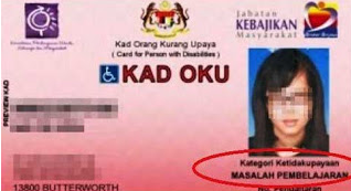Tambahan, kad OKU itu turut tertera masalah pembelajaran dalam