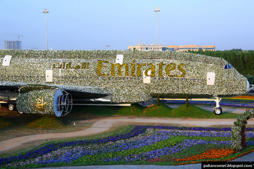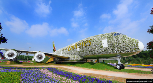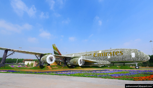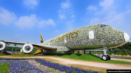 Syarikat penerbangan Emirates Airline bekerja sama dengan Dubai Miracle Garden membuat pesawat berlapis bunga terbesar di dunia.