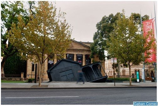 Seniman, Ian Strange telah mencipta sebuah pemasangan outdoor iaitu sebuah rumah yang seolah-olah tenggelam ke dalam tanah. Berjudul ‘Mendarat’, pemasangan itu menunjukkan sebuah rumah berwarna hitam yang kelihatan seolah-olah ditelan oleh bumi. Karya ini dibuat untuk Biennial of Australian Art 2014, yang saat ini sedang diadakan di Galeri Seni Australia Selatan di Adelaide sampai 11 Mei.