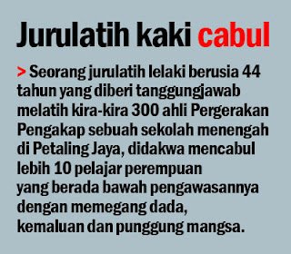 PETALING JAYA: Seorang jurulatih yang diberi tanggungjawab melatih 300 ahli Pergerakan Pengakap sebuah sekolah menengah di sini, didakwa mencabul lebih 10 pelajar perempuan yang berada bawah pengawasannya dengan memegang dada, kemaluan dan punggung mangsa.