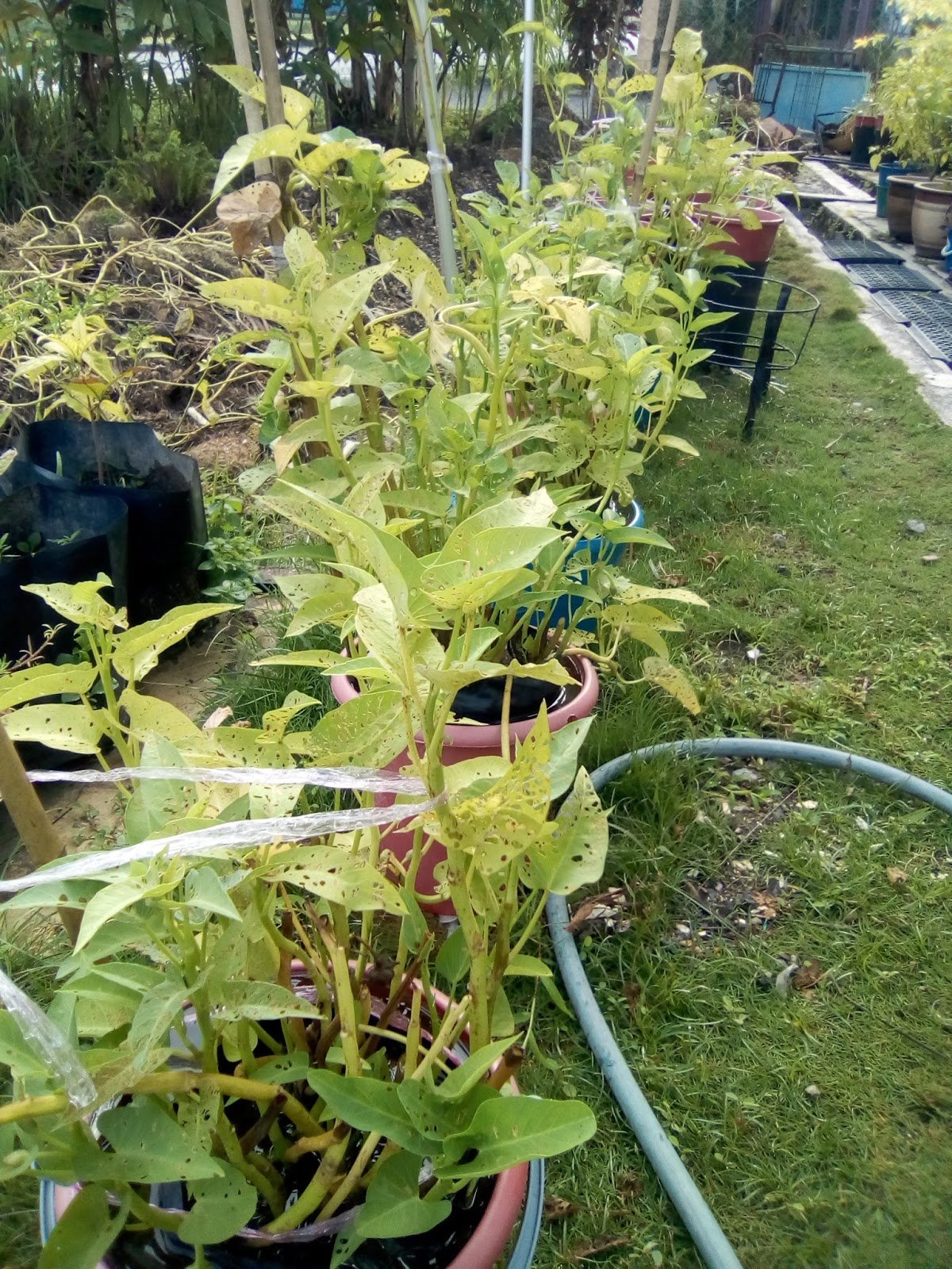 12 minggu selepas tanam untuk berbunga dan berbuah. Ada ulat yang makan daun kangkung sehingga berlubang. Tangkap dan musnahkan.