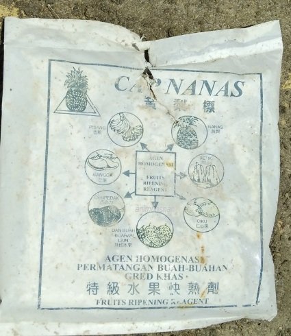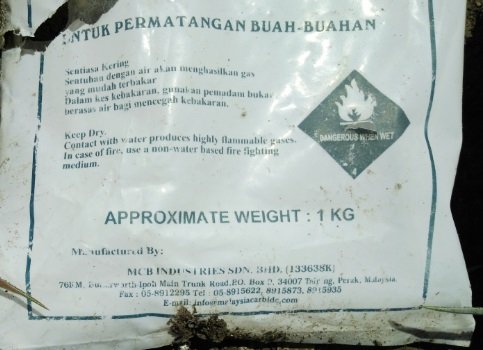 PRODUK KARBID merupakan sejenis bahan yang sesuai dan efektif digunakan untuk pembungaan nanas keluarga Queen seperti nanas Yankee, Nanas Sarawak dan nanas Golden Diamond. Penulis blog mendapati bahan penggalak pembungaan pokok nanas di Kebun Nanas Golden Diamond di Kg Bambangan, Keningau, Sabah digunakan dengan cara meluas. Kebun nanas seluas 25 hektar ini dipunyai oleh pekebun Datuk Yap yang menanamnya semanjak 3 tahun lepas. Karbid jenama ”CAP NANAS” ini dibungkus dengan bungkusan beg plastik putih sesuai digunakan dengan tanaman nanas terutama untuk kumpulan nanas Queen yang agak kurang berkesan dengan menggunakan bahan penggalak seperti, Pil ANAA, Ethrel atau Etephon. Daripada tinjauan penulis blog dikebun nanas ini, terdapat banyak bungkusan karbide ini dimerata lokasi yang terbiar selepas digunakan (Sila lihat foto diatas). Pada label jelas ditulis dimana karbide ini sangat sesuai digunakan untuk induksi pembungaan Nanas (Ananas comosus) dan agen ‘ripening’ bagi tanaman dan hasil buah-buahan seperti Pisang (Musa spp), Mangga (Mangifera indica), Betik (Carica papaya), Ciku (Manikara sapota), Cempedak (Artocarpus cempeden) dan beberapa jenis buah-buahan lain. Penelitian penulis lagi pada label ditulis sebagai ”Fruit Ripening Hormone” dalam bahasa Inggeris dan juga dalam bahasa Malaysia sebagai ”Agen Homogenasi Permatangan Buah-buahan (Gred Khas)”. Bahan kardide ini didakwa pekebun mudah dibeli daripada kedai pertanian dengan harga yang berpatutan. Artikel malam Sabtu ini saya menulis dalam ”Anim Agro Technology” mengenai produk bahan Karbide sebagai satu bahan kimia penggalak proses untuk pembungaan nanas untuk dijaikan bahan rujukkan.