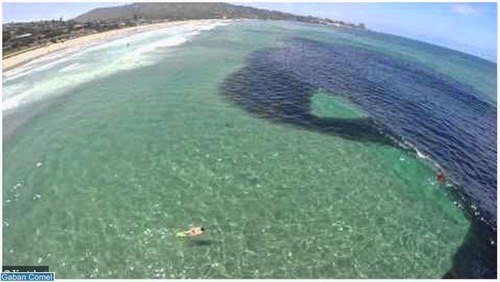 Dari atas corak hitam ini kelihatan seperti tumpahan minyak dari kapal tangki. Namun setelah dilihat dari dekat, ternyata itu adalah kawanan ikan bilis.