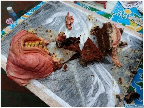 Untuk mengejutkan teman lelakinya pada hari jadinya, seniman berasal dari San Francisco, Vicky Knoop memutuskan untuk membuat kek harijadi berbentuk wajah terbelah dua dari filem seram 1984, The Thing. Hasilnya adalah sebuah kek yang benar-benar menyeramkan.