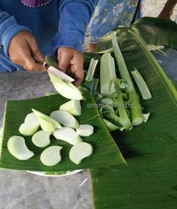 Batang keladi Lambuk yang telah dipotong dan dibiang kulit lapisan luarnya kemudian sudah sesuai untuk proses berikutnya. Ia per;u dipotong pendek menggunakan pisau tajam sekitar ukuran 1.0 – 1.2 cm panjang bergantung keapada kehendak tukang masak (Sila lihat foto disebelah). Sebaiknya kerja memotong nipis batang keladi lambuk ini dilakukan diatas lapisan daun pisang, bekas plastik dan pastikan tidak kotor terkena benda asing seperti tanah. Ada beberapa petua memasak keladi lambuk yang penulis blog dapat maklumat dimana masakkan keladi lambuk tidak sesuai dicampur dengan bahan lain seperti jagung, kentang, terung dan sebagainya didalam gulai dimana ia akan juga menjadikan makanan tersebut menjadi gatal. Pengalaman penulis di IP Kuala Lipis baru-baru ini mengesahkan bahawa jika sayuran keladi lambuk ini dicampur dengan jagung telah menyebabkan rasa ‘gatal’ ditekak selepas memakannya. Keladi lampuk yang dipotong-potong dibersihkan dan terus dimasak atau di bungkus untuk dijual dipasar minggu atau pasar tani. Sebaiknya pembungkusan keladi lambuk yang dijual adalah dalam bentuk batang yang belum dipotong, kiub yang telah siap dipotong malahan ada yang menjualnya sebagai batang keladi lambuk yang asli (tidak dibuat apa-apa prosesan).
