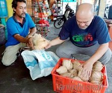 Dalam akhbar Berita Harian juga penulis blog merujuk laporan oleh wartawan Mohd Farid Noh telah menulis artikel bertajuk ”Harga kelapa turun 25 sen” di petik daripada Batu Pahat. Foto disebelah adalah bagaimana pekerja sedang memunggah buah kelapa import daripada bot untuk ianya dimuatkan ke dalam lori dan diagihkan ke seluruh negara bagi memenuhi permintaan perayaan Aidilfitri yang akan menjelang di Pelabuhan Barter Trade Batu Pahat. Harga kelapa dilaporkan masa ini mencatat penurunan 25 sen sebiji sepanjang Ramadan dan menjelang Aidilfitri kali ini, berikutan kemasukan banyak kelapa dari Indonesia. Pengurus Pusat Operasi Lembaga Pemasaran Pertanian Persekutuan (FAMA) Batu Pahat, Musa Abdul Kahar, berkata penurunan harga kelapa disebabkan kemasukan kira-kira tiga juta biji kelapa import bersamaan 3.3 juta tan dari Indonesia ke dalam negara sempena musim perayaan kali ini, di samping musim kelapa tempatan yang sedang mengeluarkan hasil. Penurunan harga kelapa di pasaran sepanjang Ramadan dan Aidilfitri jarang berlaku sebelum ini, terutama menjelang musim perayaan berikutan permintaan tinggi. Penurunan harga kelapa di pasaran sepatutnya bermula awal Ramadan berikutan kemasukan kelapa import secara besar-besaran bagi menstabilkan, harga selain memenuhi permintaan menjelang musim perayaan. Ini bermakna harga sebiji kelapa sepatutnya antara RM1.80 sehingga RM2.20 di pasaran berbanding antara RM2.80 sehingga RM3 sebiji sepanjang Ogos 2017 hingga Januari lalu. Ketika itu musim kelapa melawas (tidak berbuah) di samping kekurangan Permit Import (AP) kelapa dikeluarkan. Kini harga 1,000 kilogram atau satu tan kelapa sekarang kira-kira RM700 atau bersamaan 70 sen sekilogram berbanding antara Ogos 2017 hingga Januari lalu yang mencecah antara RM1,100 hingga RM1,200 atau bersamaan RM1.10 sehingga RM1.20 sekilogram. Sehingga kini dilapor sebanyak 1.6 juta tan kelapa dari Indonesia untuk kegunaan Semenanjung dibawa masuk menerusi pelabuhan di Batu Pahat serta Pahang bermula awal Ramadan dan dijangka selesai pada minggu akhir Ramadan,” katanya kepada NSTP ketika membuat pemeriksaan kemasukan kelapa di Pelabuhan Barter Trade Batu Pahat. Mengenai harga sebiji kelapa yang dilaporkan mahal sehingga mencecah RM3 sebiji di Kuantan, Pahang minggu lalu, Musa berkata, tiada sebab ia berlaku kerana bekalan dari Indonesia turut dibawa ke sana. Hanya sebahagian Perak dan Selangor yang banyak menggunakan kelapa tempatan dari Bagan Datuk dan Hulu Selangor serta tidak terlalu bergantung kelapa import. Musa berkata, stok kelapa yang dibawa masuk dari Pelabuhan Barter Trade Batu Pahat dihantar dan diagihkan ke Pusat Agihan FAMA di Alor Setar, Kedah; Pusat Agihan FAMA di Bukit Mertajam, Pulau Pinang; Gopeng, Ipoh; Senawang, Negeri Sembilan; Melaka dan Batu Pahat, Johor. Beliau berkata, pengagihan yang dijangka selesai pada minggu akhir Ramadan itu bagi membolehkan stok kelapa disimpan untuk kegunaan pada dua minggu musim Aidilfitri ini berikutan kemasukan dari Indonesia disambung semula selepas 10 hari cuti Aidilfitri. Katanya, semua kelapa import dibawa masuk menerusi lebih 40 kapal dan tongkang kecil dari Kepulauan Riau, Indonesia seperti Bengkalis, Guntong, Penjuru, Tanjung Samak serta Palembang sebelum tiba di Batu Pahat.