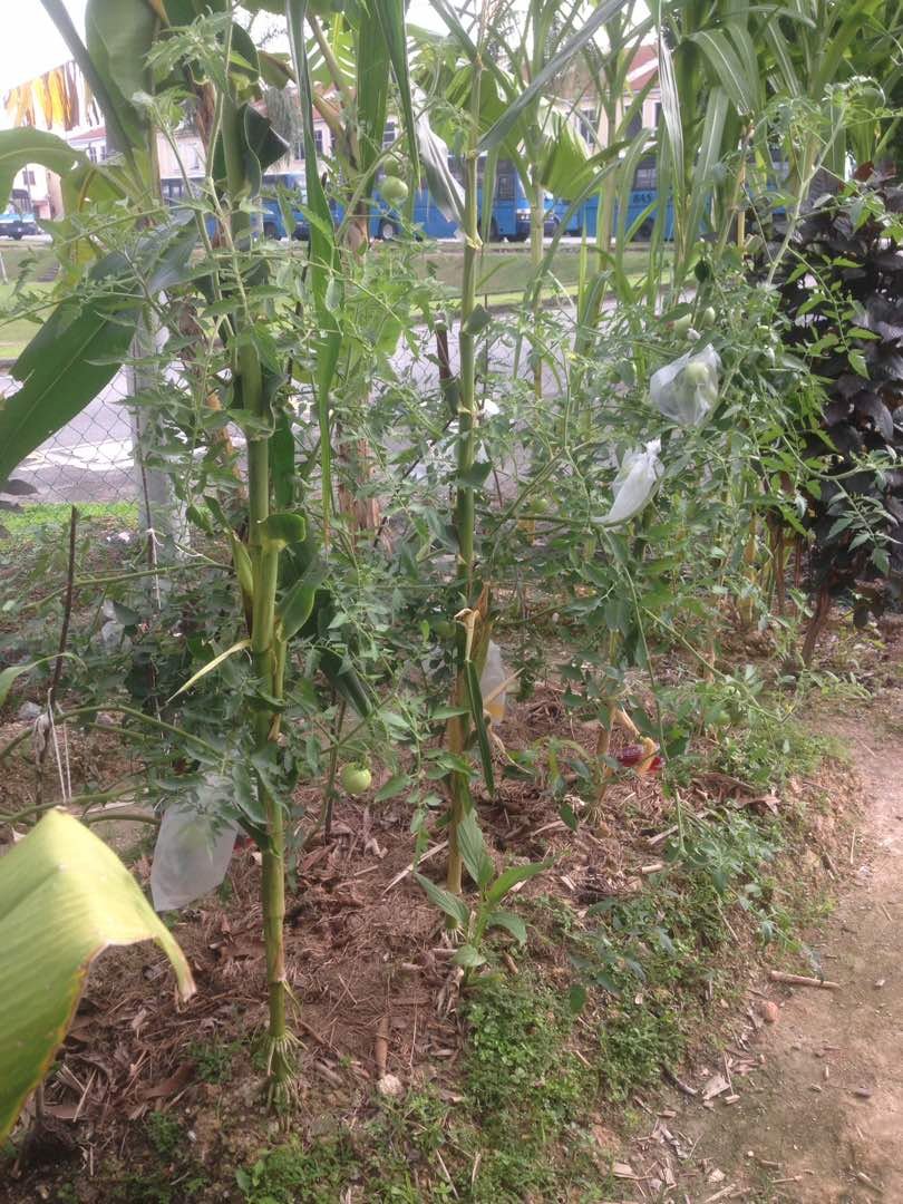 Pokok jagung yang sudah dituai di tebang untuk dikomposkan manakala pokok tomato yang sedang berbuah di buang daun2 yang telah tua