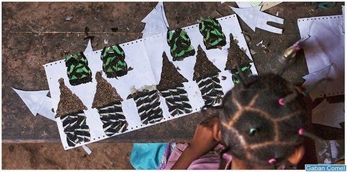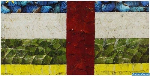 Karya seni ini berbentuk sebuah lukisan dengan gambar unik yang khas Afrika . Biasanya lukisan ini bergambar tokoh sejarah kuno Afrika . Dan ternyata , lukisan-lukisan ini terbentuk dari potongan – potongan sayap rama – rama . Wow , unik sekali ya .