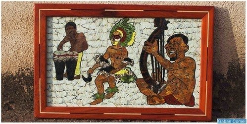 Karya seni ini berbentuk sebuah lukisan dengan gambar unik yang khas Afrika . Biasanya lukisan ini bergambar tokoh sejarah kuno Afrika . Dan ternyata , lukisan-lukisan ini terbentuk dari potongan – potongan sayap rama – rama . Wow , unik sekali ya .