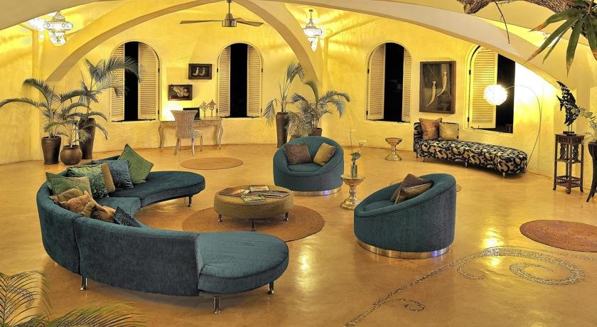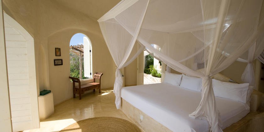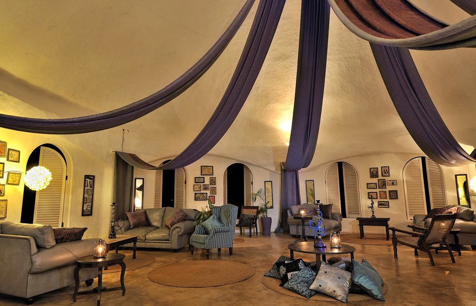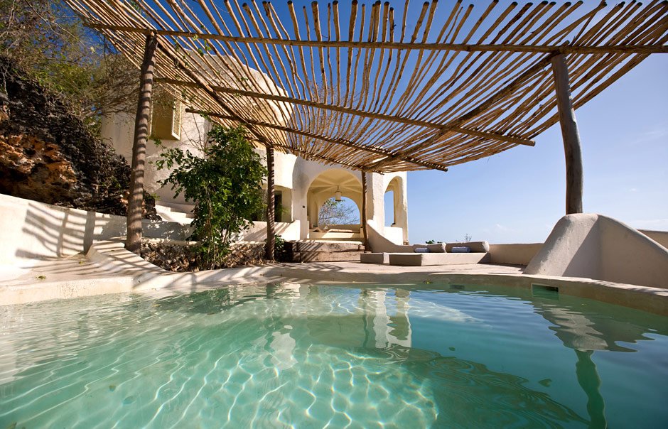 Set in a large and mature garden, a stone build, and linked by a series of wooden walkways, Kilindi consists of a main lodge and 15 sleeping rooms (pavilions). The shared areas include a lounge, dining room, bar, swimming pool, spa and extensive veranda. Design-wise, the lodge takes its lead from the dome-like structures that have for centuries marked Muslim architecture, the bright white exteriors designed to reflect the heat, the cavernous innards well suited to the task of harnessing the sea breeze, and of funneling hot air up and out through its long glassless windows. Inside, highly polished floors, uncluttered furniture arrangements and isolated pieces of art set the tone for interiors that are strictly – in the best sense of the word – thought through, the overall impression being one that in its clarity of vision matches the startling simplicities of the sand, the sky and the sea. Covered walkways provide shade, soften the borders between inside and out, and ornamental arches extend the idea of structure into the garden.