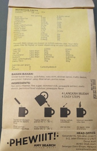 Produk kopi Phewit ini dikeluarkan secara OEM oleh sebuah syarikat di Johor Bahru dengan jenama ‘Kopi Nanas Phewit’. Phewit pula kini merupakan satu ikon kepada penyanyi rock lagenda Amy Search yang mempunyai ramai peminat di Malaysia, Indonesia, Brunei malahan di Jepun. Bahan-bahan yang digunakan seperti ditulis pada label berwarna coklat (Sila lihat foto diatas sekali dan di sebelah) adalah krimer bukan tenusu, gula halus, susu krim, ekstrak nanas, malto dextrin, penstabil makanan, serbuk kopi dan perisa kopi. Produk kopi nanas yang dikeluarkan oleh Syarikat Qasander KL Sdn Bhd ini berpejabat di Shah Alam, Selangor menggunakan moto 4 langkah mudhah untuk menyediakan kopi nanas. Empat langkah tersebut adalah tuang kandungan kopi nanas dalam sachet kedalam mug, tuang 180 ml liter air panas, kacau untuk sebatikan dan akhirnya nikmati keenakkan citarasa kopi nanas. Pastinya anda akan mendapat bau dan rasa kopi dahulu tetapi kemudian bau dan rasa buah nanas akaan dinikmati kemudiannya. Seni minum kopi nanas ini agak berbeza dengan kopi biasa kerana anda perlu minum kopi nanas dengan kaedah betul dan perlahan-lahan. Rasa nanas akan dirasakan ditekan dengan keperihatinan peminumnya. Kena cuba dahulu baru anda boleh kata.